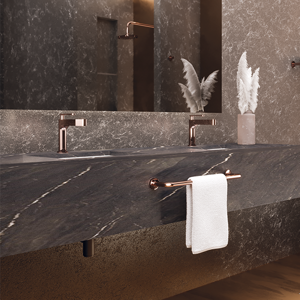 Las atmósferas se construyen con materiales que evocan introspección: piedras naturales de vetas marcadas, cerámicas artesanales con esmaltes irregulares y superficies metálicas en tonos de bronce o cobre envejecido. La presencia del mármol oscuro y los espejos tintados multiplica la profundidad del espacio, generando una sensación envolvente.